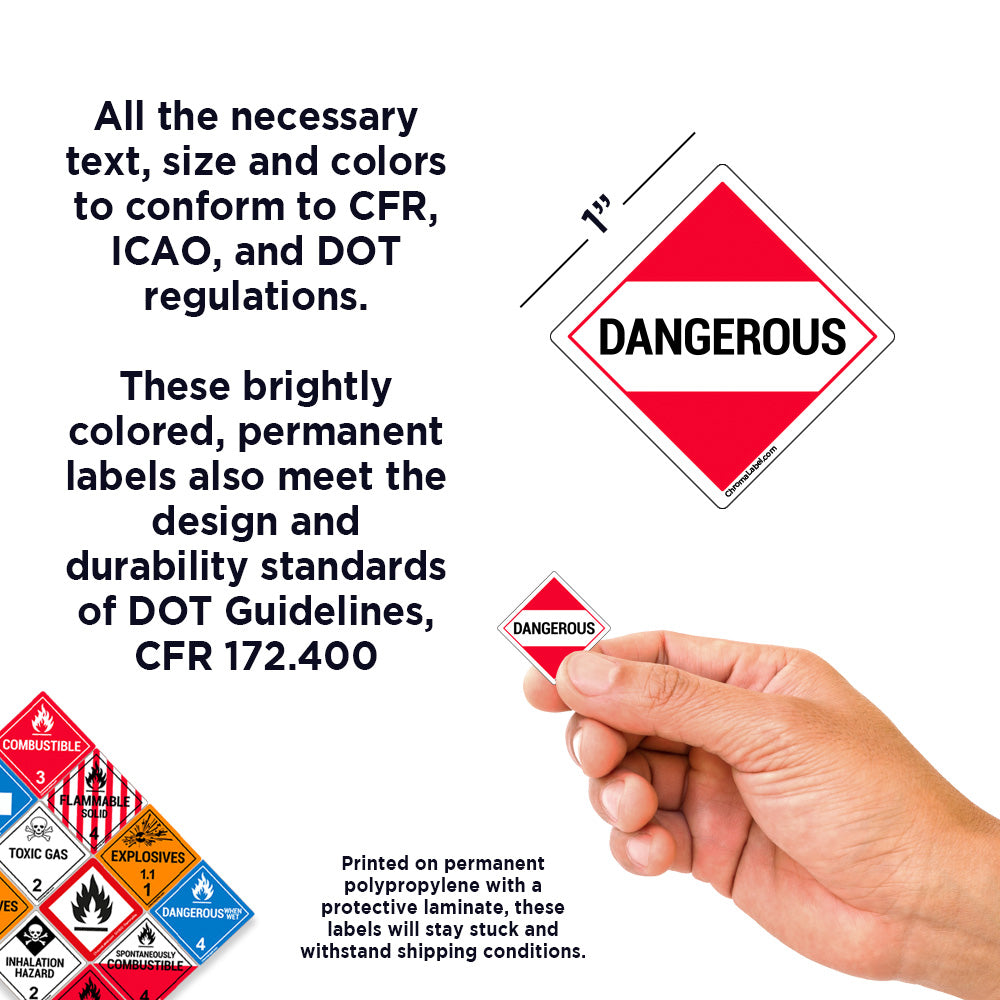 With all necessary text, size, and colors to conform to CFR, ICAO and DOT regulations, these brightly colored, permanent labels also meet the design and durability standards of DOT Guidelines, CFR 172.400