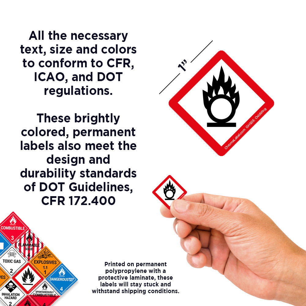 1" x 1" Permanent Durable D.O.T. Hazard Labels: GHS03: Oxidizing Pictogram, 250/Roll