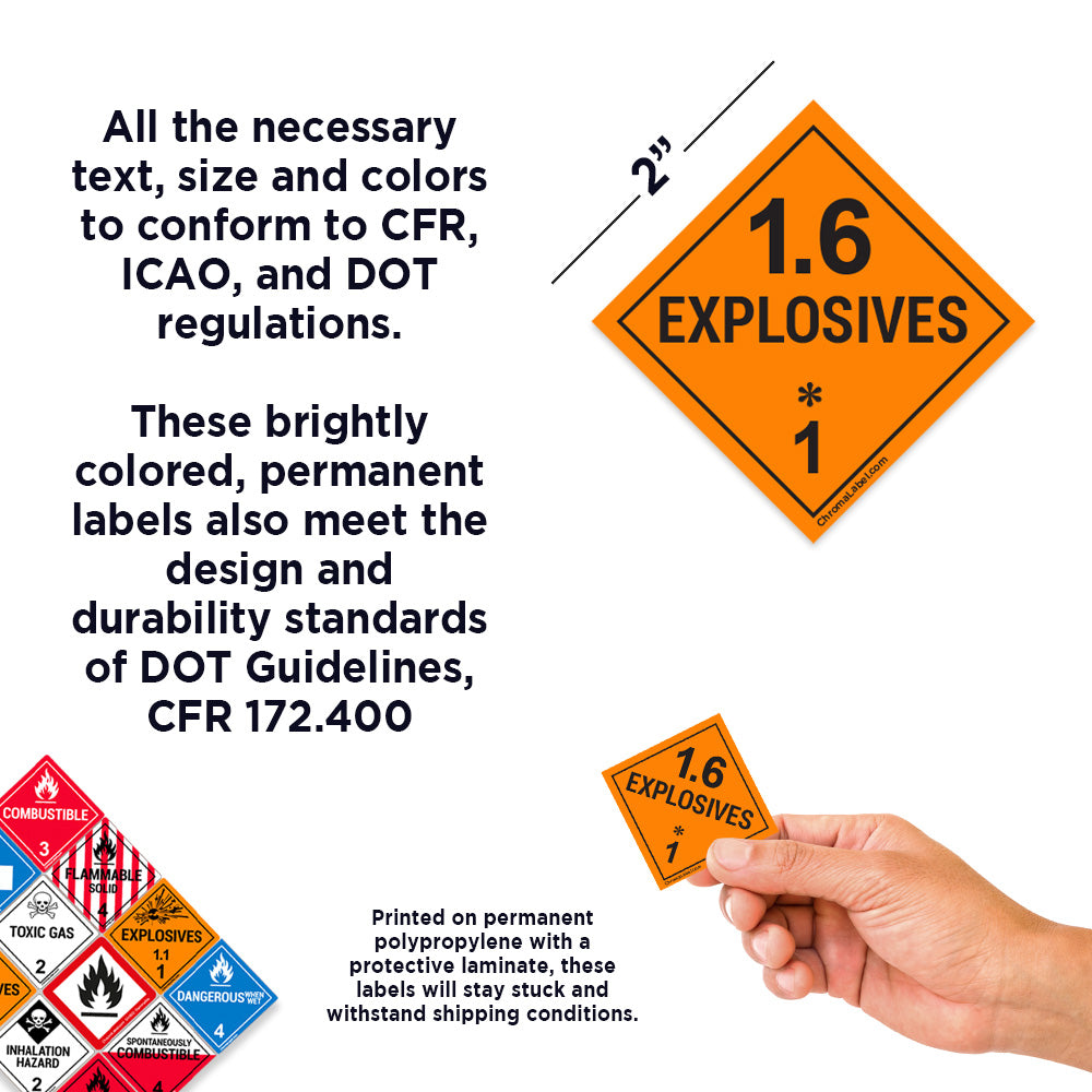 2" x 2" Permanent Durable Square D.O.T. Hazard Labels, Hazard Class 1.6 Explosives Label, 100/Roll