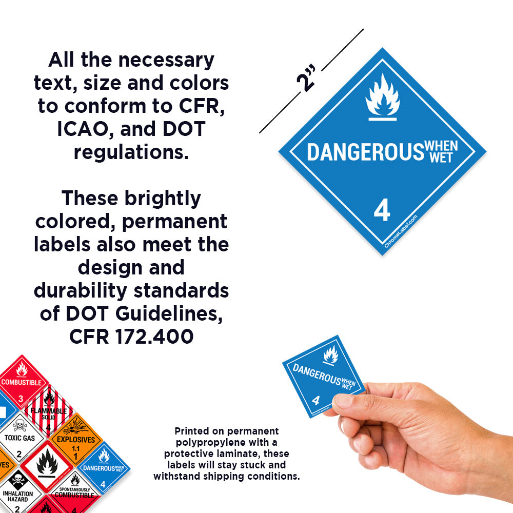 2" x 2" Permanent Durable Square D.O.T. Hazard Labels, Hazard Class 4 Dangerous Wet Label, 100/Roll