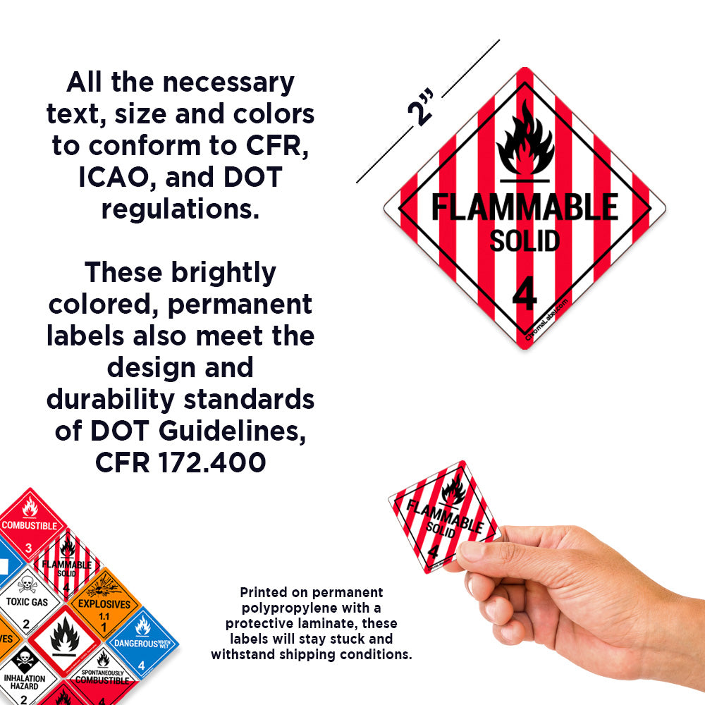 2" x 2" Permanent Durable Square D.O.T. Hazard Labels, Hazard Class 4 Flammable Solid Label, 100/Roll