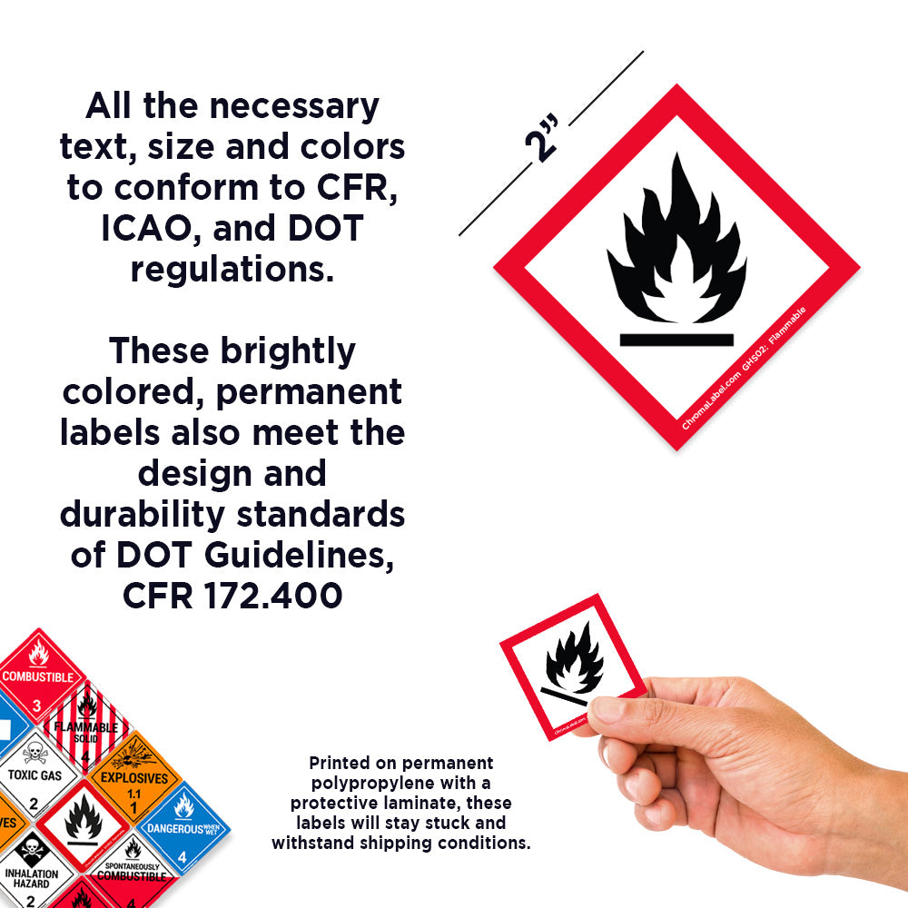 2" x 2" Permanent Durable Square D.O.T. Hazard Labels, GHS02: Flammable Pictogram Label, 100/Roll