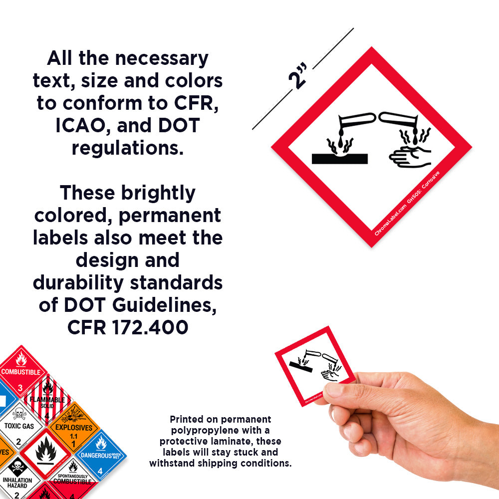 2" x 2" Permanent Durable Square D.O.T. Hazard Labels, GHS05: Corrosive Pictogram Label, 100/Roll