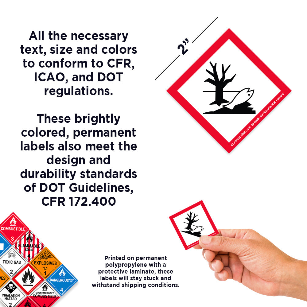 2" x 2" Permanent Durable Square D.O.T. Hazard Labels, GHS09: Environmental Hazard Pictogram Label, 100/Roll