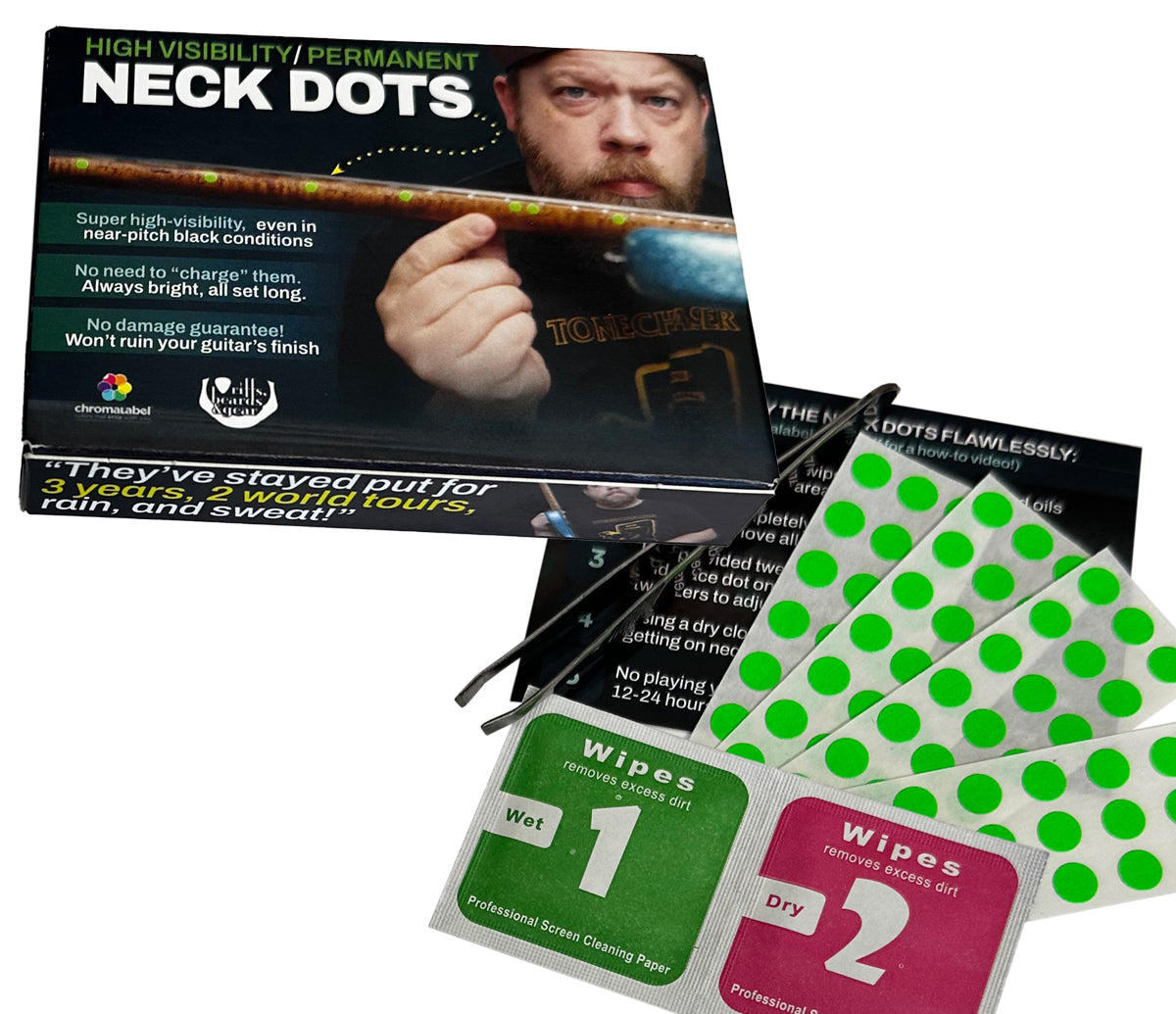AFTER WATCHING RIFF ON his YouTube RIFFS beards And Gears (tell him i said to look him up) I had to have some green dots for my bass guitar neck. They're great playing bass in a darker room the dots give me a reference so I can hit all the right notes.