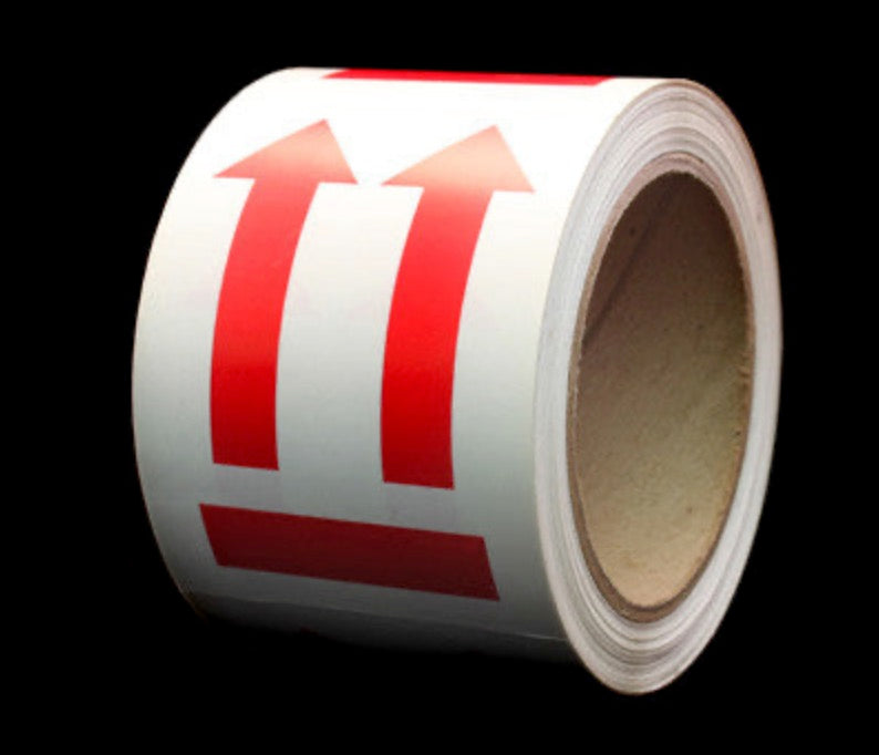 These three inch by four inch labels feature universally understood graphics: two red arrows pointing up with a red line below them which clearly denotes which side of your package must be kept up. The stickers are finished on shiny, paper label stock to give them extra visibility to package handlers.