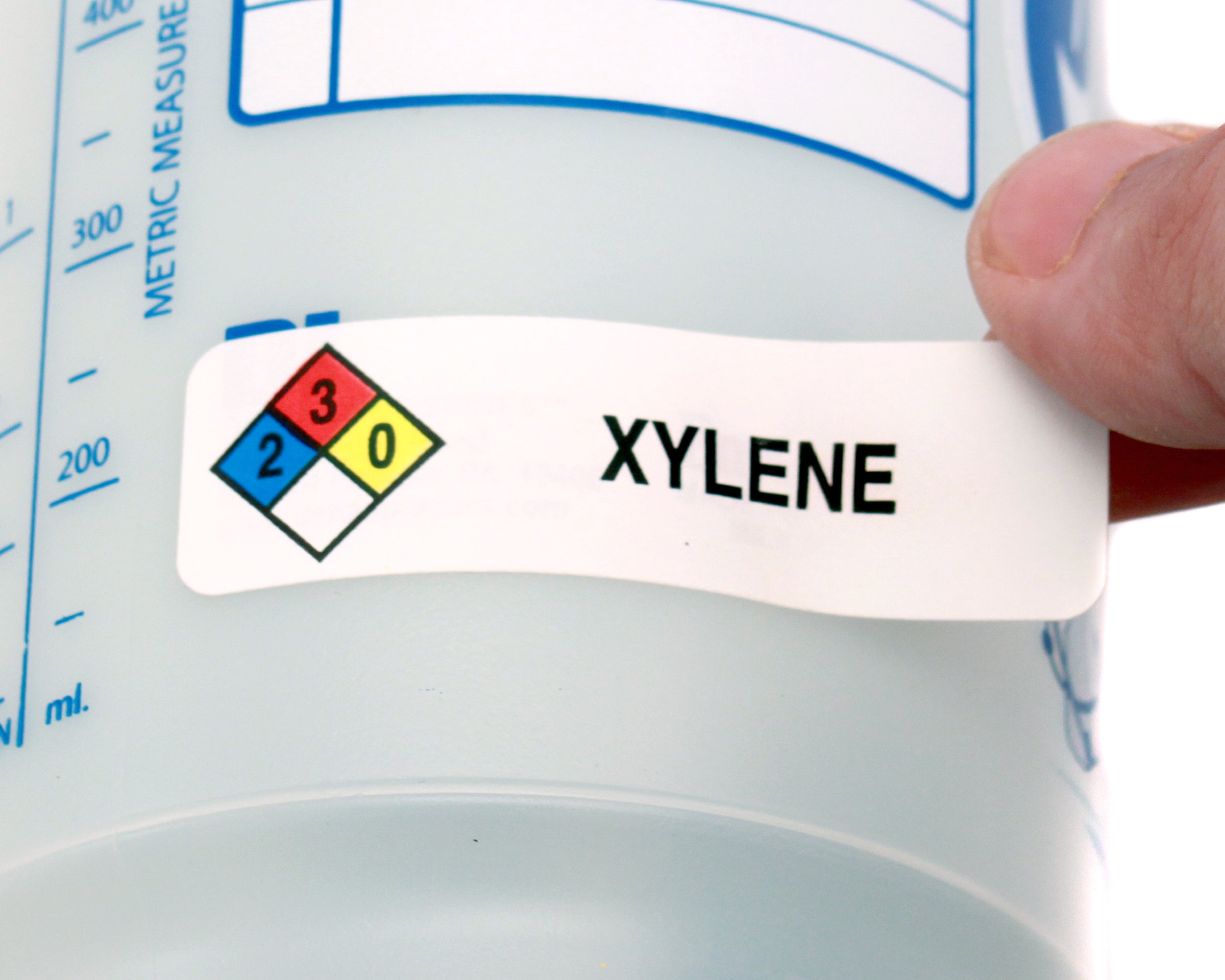 Easily fill in the appropriate safety information on these matte-white safety labels. Each 0.75" x 2.5" label has the four-colored NFPA diamond for you to write in the appropriate number. Use the additional five lines to the right of the safety diamond to fill in the chemical name, common name, manufacturer, MSDS# and date. In the application of nonporous surfaces, you can cleanly remove the labels and re-use them a couple times.